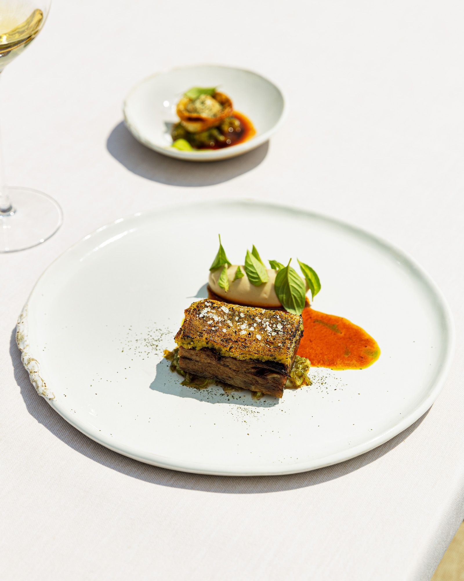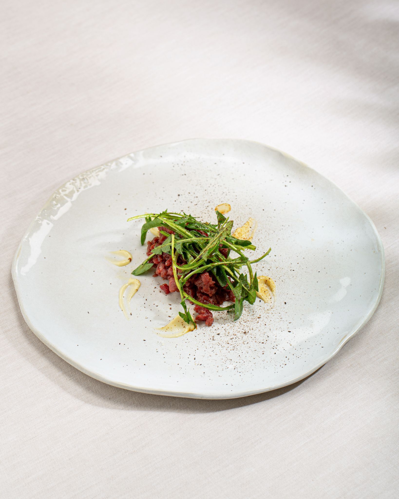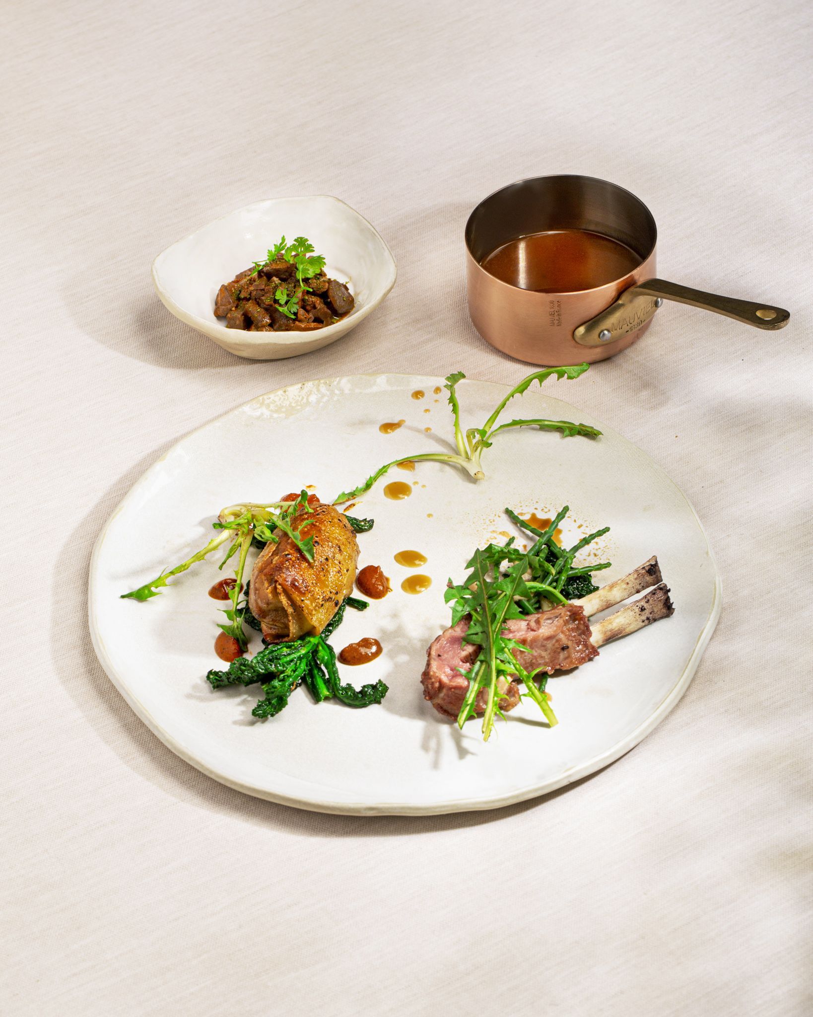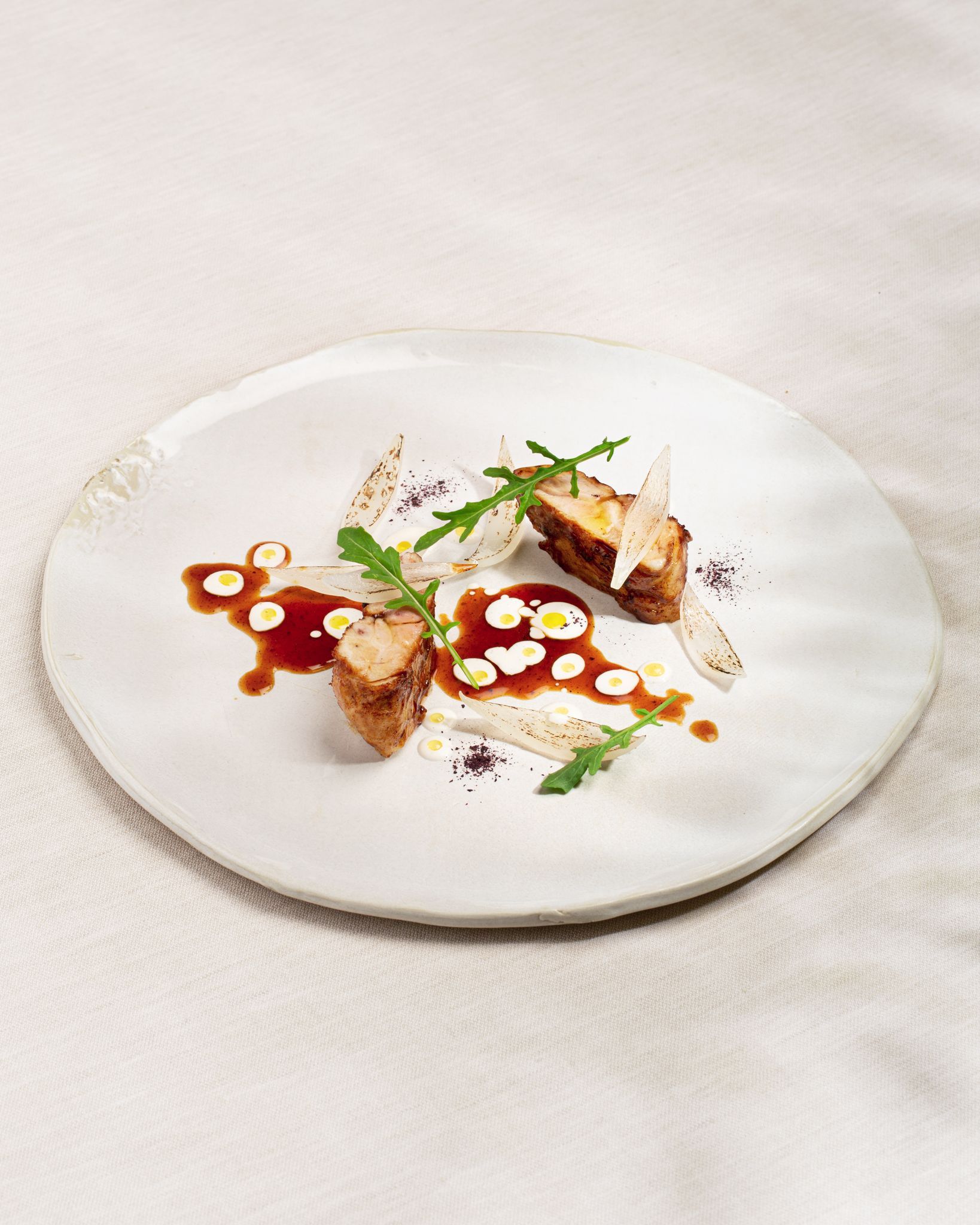 Cervo marinato, nocciole, capperi e caviale - Daino bollito e peperoni sotto graspa - Lepre: ravioli in civet - Cinghiale da latte in fricassea, fregola e mirto - Germano reale in crosta, verze e senape - Fine della battuta: torta di re di crava, pere e aceto