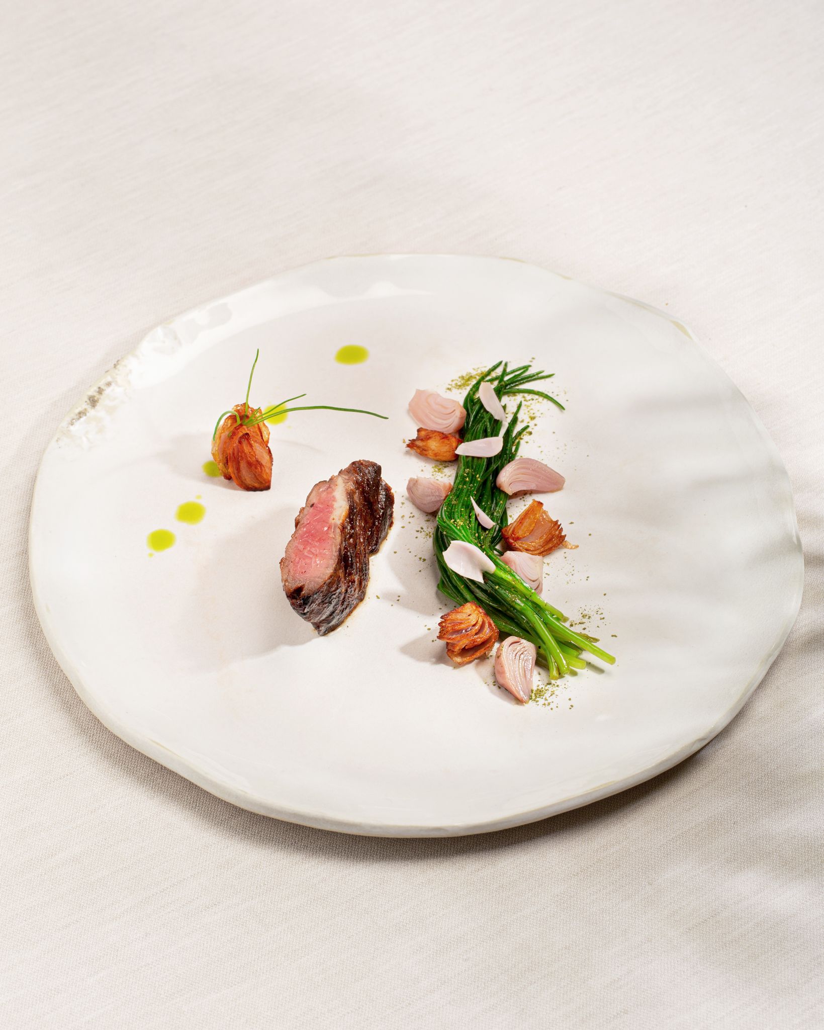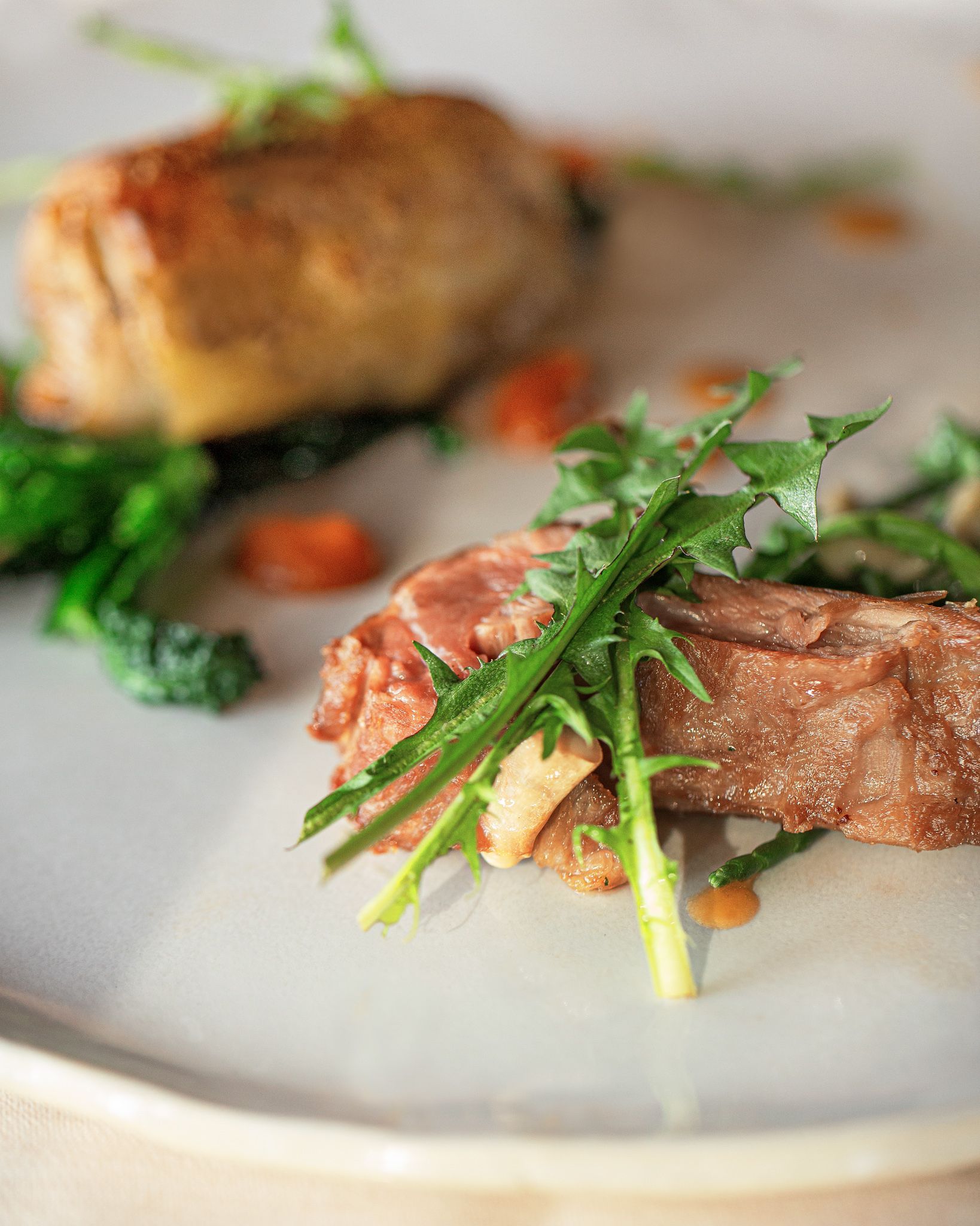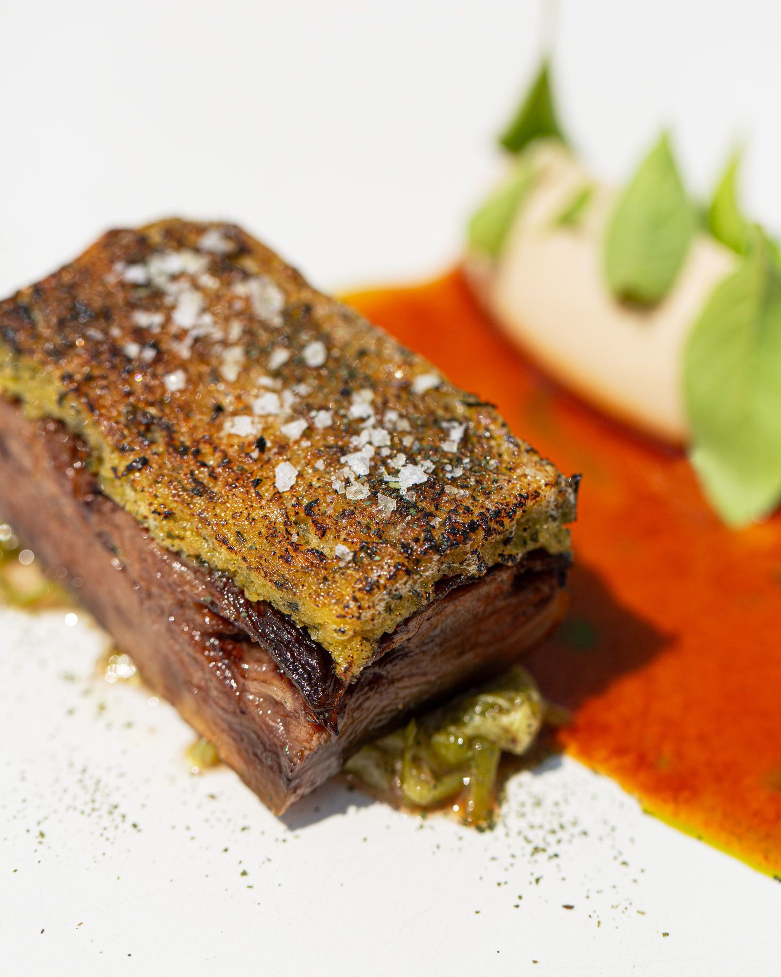Cervo marinato, nocciole, capperi e caviale - Daino bollito e peperoni sotto graspa - Lepre: ravioli in civet - Cinghiale da latte in fricassea, fregola e mirto - Germano reale in crosta, verze e senape - Fine della battuta: torta di re di crava, pere e aceto