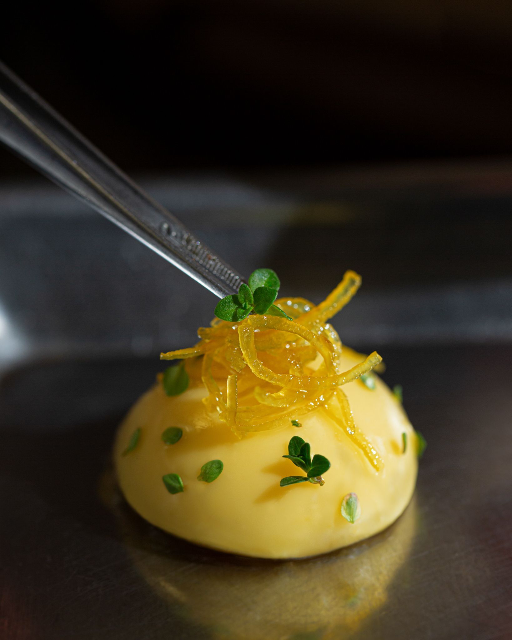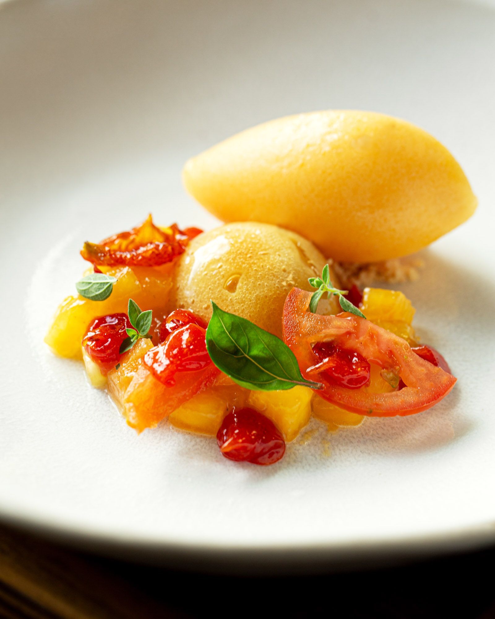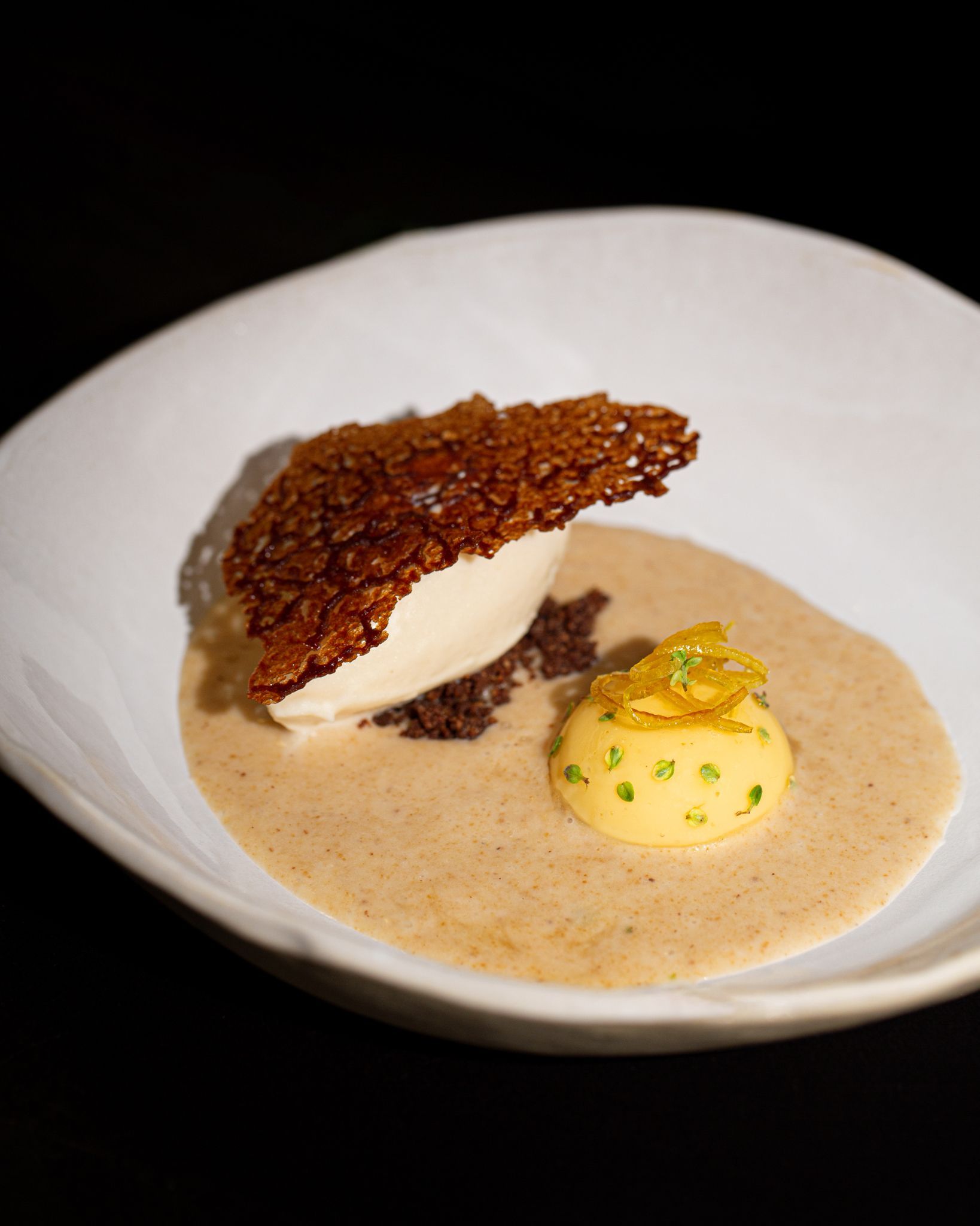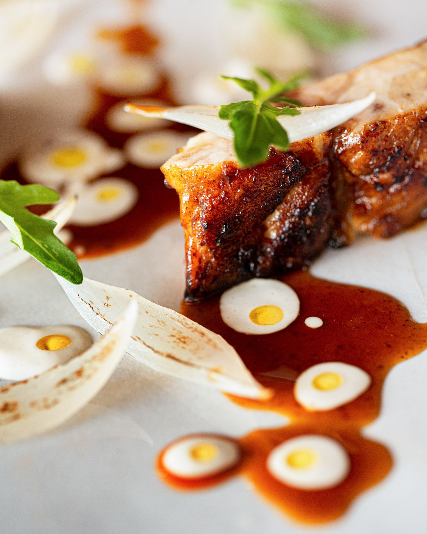 Cervo marinato, nocciole, capperi e caviale - Daino bollito e peperoni sotto graspa - Lepre: ravioli in civet - Cinghiale da latte in fricassea, fregola e mirto - Germano reale in crosta, verze e senape - Fine della battuta: torta di re di crava, pere e aceto